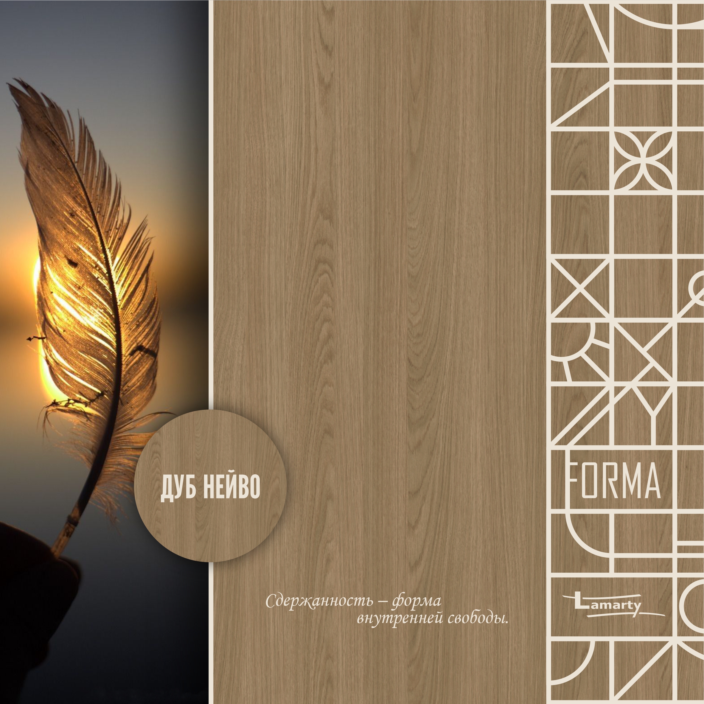 Тёплый древесный оттенок, в котором живёт искренность натурального дуба. Его поверхность ровная, спокойная, лишенная резких контрастов, дарит пространству ощущение безупречной чистоты и естественной гармонии. Эксклюзивное тиснение «Дуб» придаёт декору особую выразительность и естественность, создавая эффект настоящего дубового шпона.