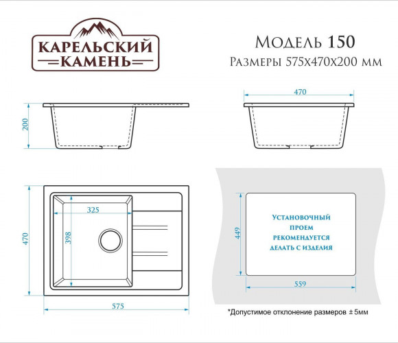 Мойка Модель 150, Прямоугольная Малая 575х470х218мм, Хлопок Q7 Мрамор