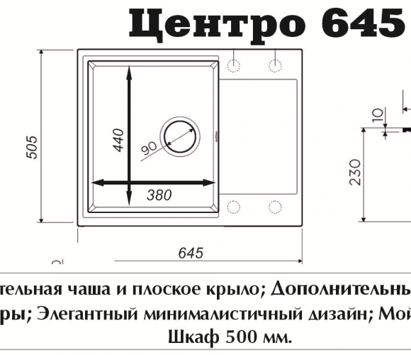 - Вместительная чаша и плоское крыло. - Дополнительные отверстия под аксессуары. - Элегантный минималистичный дизайн. - Мойка оборачиваемая. - Шкаф 500мм.