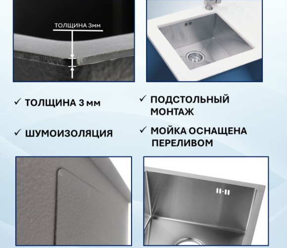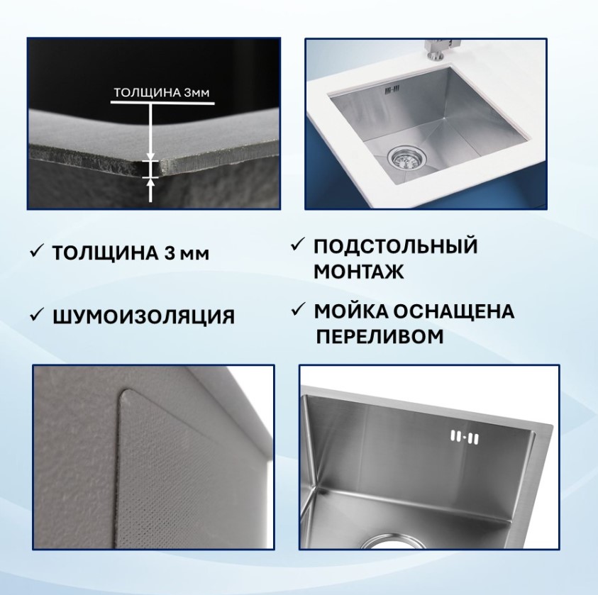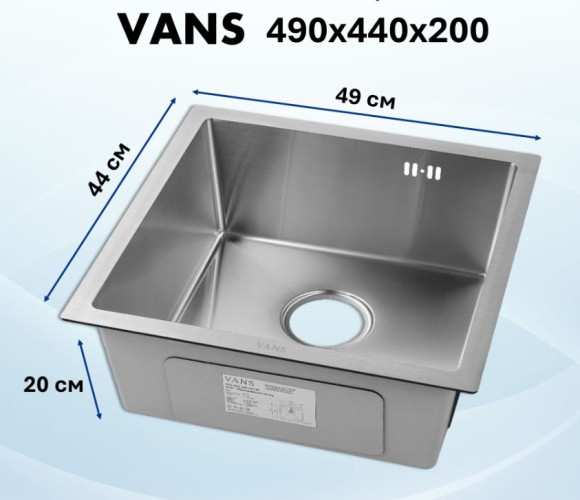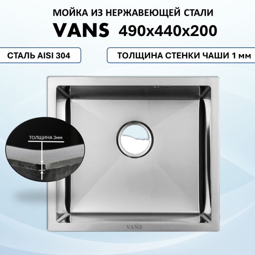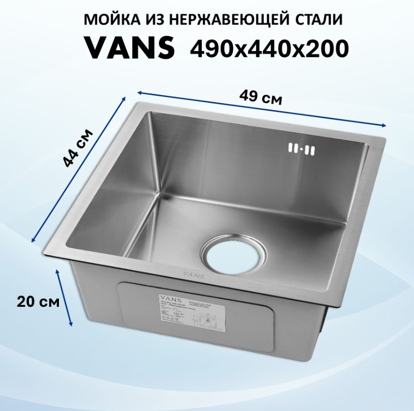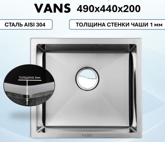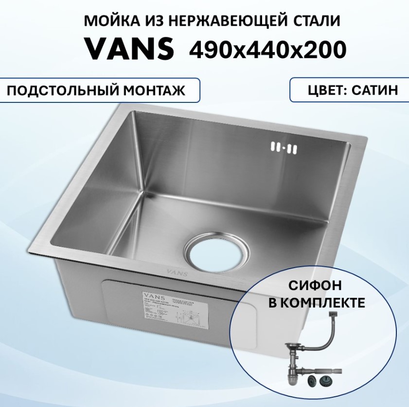 Мойка VANS подстольного монтажа (490х440х200мм, толщ.3+1мм), SATIN VAS UTM