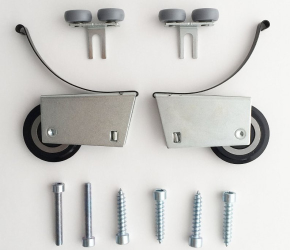 В комплект входит два верхних ролика (симметрия), два нижних, два винта  М5 и 4 самореза 5Х30 мм.
