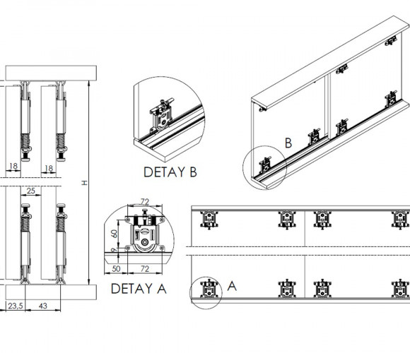 Применение: Механизм LC 75 AY Lucido используется для раздвижных дверей толщиной 18-22 мм и весом до 75 кг. В комплект входит универсальный ролик(4 шт) и стопор (2 шт). Ролики универсальные (без фрезеровки фасада)- монтируются как на низ, так и на верх двери. Монтаж на двери из ДСП. На 1 дверь нужно 1 кт. Установка механизма: 1. Установите пластиковые стопоры на нижнюю и верхнюю алюминиевые направляющие. 2. Установите алюминиевые направляющие на верхний и нижний столы шкафа. 3. Определите длину двери, расстояние внутри шкафа (H) и длину двери (L) как L = H-12. 4. Просверлите крышки в соответствии с отверстиями, указанными на монтажной схеме. 5. Соберите механизмы на крышках. 6. Поместите крышки в нижний канал рельса так, чтобы ролики механизма были обращены, и потяните механизмы вниз для верхнего рельса, соединения крышки и поместите ролики в верхний рельс. 7. Зафиксируйте нижний и верхний стопоры в соответствии с движением двери. 8. Отрегулируйте угловатость крышек с помощью регулировочного винта на механизме.