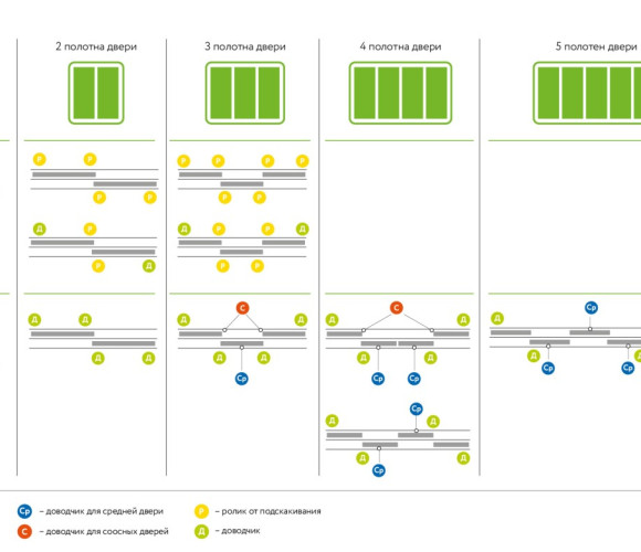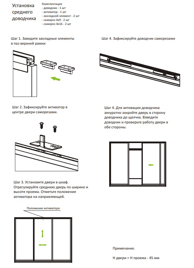 Доводчик устанавливается на среднюю дверь трехдверных шкафов и позволяет открывать ее в любом направлении. При закрытии доводчик подхватывает дверь шкафа-купе и мягко позиционирует ее в центре шкафа. Таким образом двери шкафа-купе всегда остаются закрытыми и аккуратно стоят на своем месте. Доводчик для средней двери устанавливается в верхнюю направляющую, а его активатор ставится на дверь. Такая компоновка позволяет устанавливать доводчик для средней двери вместе со стандартными доводчиками, что позволяет добиться эффекта плавного открывания в любую сторону и правильного позиционирования при закрытии.