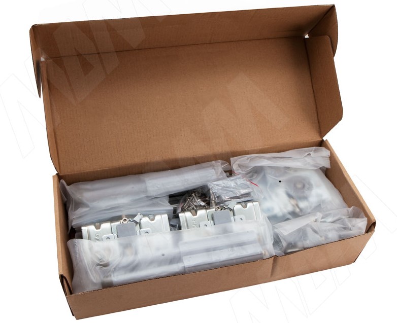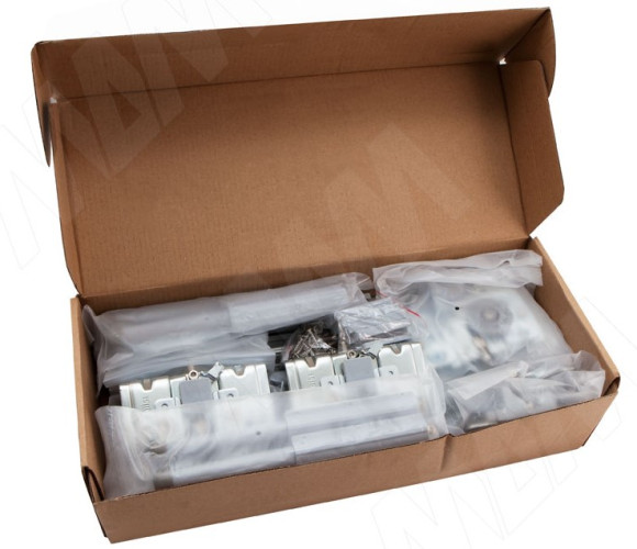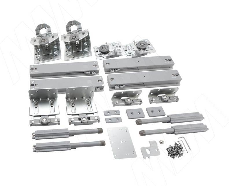 Комплектация: верхний ролик — 4 шт., нижний ролик — 4 шт., доводчик — 4 шт., демпфер — 4 шт., активаторы, фиксаторы направляющей, саморезы
