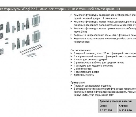 Комплект фурнитуры WingLine L, макс. вес створки 25 кг с функцией самозакрывания, 600 мм, левая |