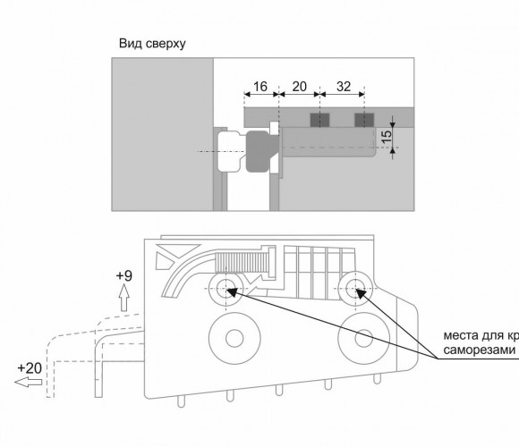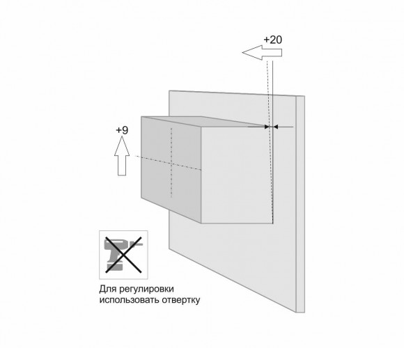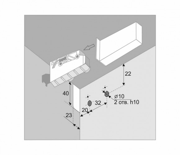 Модель устанавливается на боковых стенках внутри мебельного корпуса в заранее просверленные отверстия в плите. Футорки навеса (являющиеся частью его корпуса) легко соединяются с проделанными отверстиями и затягиваются с помощью саморезов, надёжно фиксируя CH07 на плоскости в четырёх точках, что обеспечивает высокую надёжность крепления. При помощи болтов на корпусе навеса, производится регулировка расстояния от короба до стены + 20 мм и положения по высоте + 9 мм.