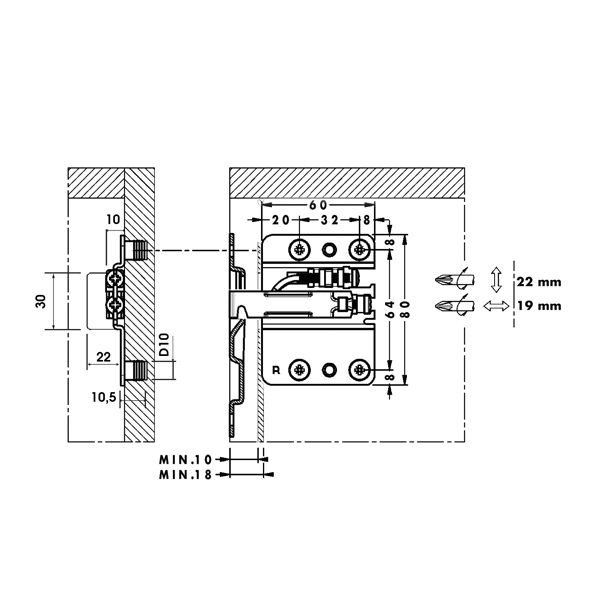 Подвеска каркаса MF применяется для нижних шкафов весом до 120 килограмм. Этот мебельный навес открывает творческий простор для дизайнеров интерьера. Мебель висящая на таких подвесах не требует декоративных опор, и как бы парит в воздухе. Подвески каркаса 807 абсолютно безопасны в использовании и имеют запатентованную защиту от случайного падения шкафа. Демонтаж шкафа производится при помощи отвертки, которую надо упереть в защитную пружину, находящуюся в крепежной пластине.