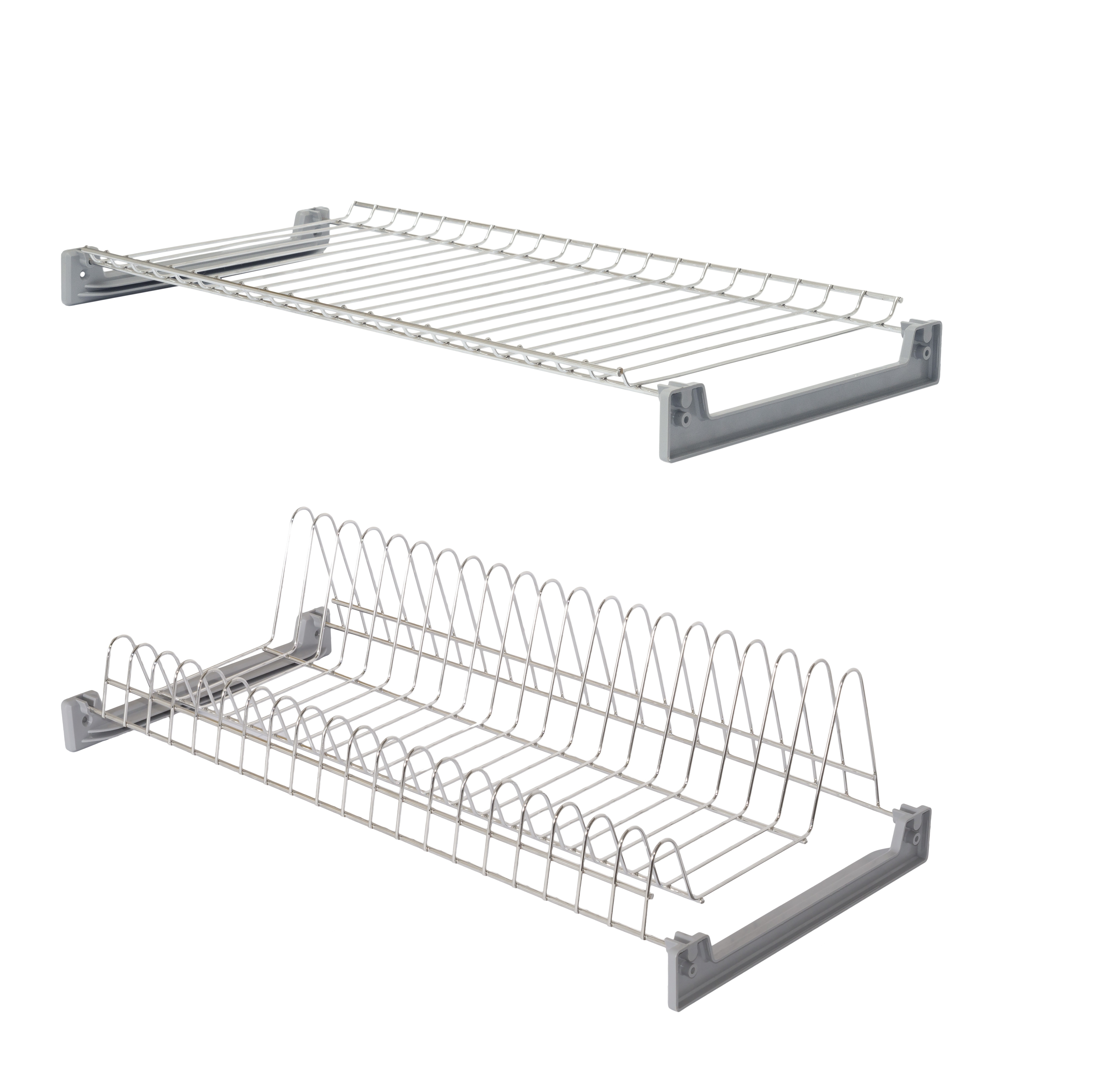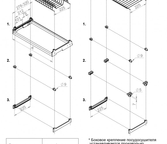 Комплектующие: держатель для посудосушителя, держатель посудосушителя для поддона, рамка телескопическая, поддоны: пластиковый.