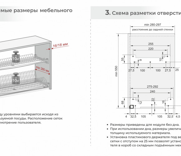 Габаритная глубина держателя верхнего уровня - всего 255 мм, что позволяет устанавливать сушку в компактных модулях со складным подъёмным механизмом!