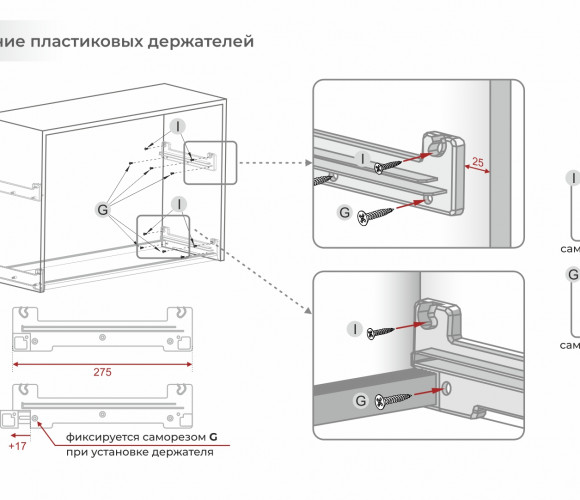 Регулируемый нижний держатель допускает установку в короб с внутренней глубиной от 280 мм и монтаж задней стенки 4 мм в паз.