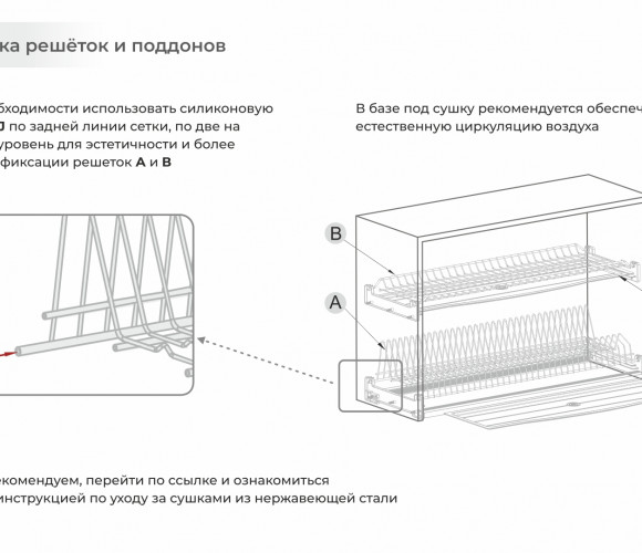 В комплект входит: решётка для кружек, решётка для тарелок, 2 съёмных пластиковых поддона нейтрального оттенка, 2 комплекта пластиковых держателей нижнего и верхнего уровня, 2 соединительных трубки, саморезы M4x20 – 12 штук, саморезы 3,5х8 – 4 штуки, саморезы 3х16 – 8 штук, силиконовые футорки – 4 штуки.