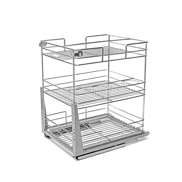 Трехъярусная выдвижная корзина из хромированного прутка, с донным креплением, на направляющих скрытого монтажа с доводчиком. Предназначена для монтажа в нижний кухонный модуль шириной 300 мм. На одной из полок встроены ограничители для банок и бутылок. В комплект механизма входит необходимый крепеж и подробная инструкция для монтажа.