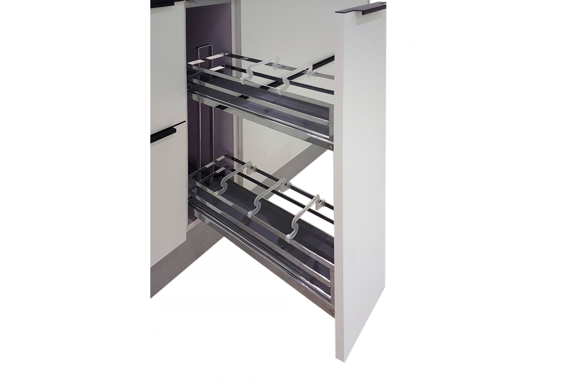 FLORA — это современная комфортная бутылочница с амортизацией, предназначенная для удобного хранения емкостей различной высоты в модулях шириной 150 или 200 мм.