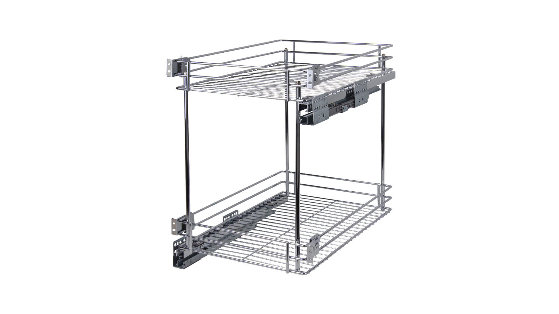 Установка направляющих по диагонали обеспечивает наиболее жёсткое крепление, лучшее сцепление каждого яруса корзины с направляющими и стабильный ход при полном выдвижении, даже с максимальной загрузкой корзины.
