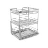 Трехъярусная выдвижная корзина из хромированного прутка, с донным креплением, на направляющих скрытого монтажа с доводчиком. Предназначена для монтажа в нижний кухонный модуль шириной 400 мм. На одной из полок встроены ограничители для банок и бутылок. В комплект механизма входит необходимый крепеж и подробная инструкция для монтажа.