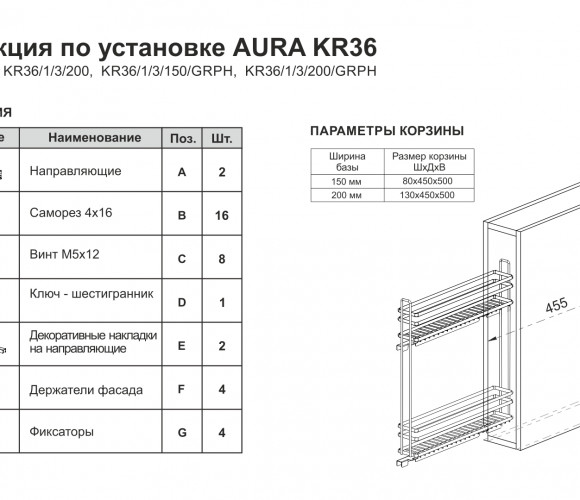 Модель оснащена специальным держателем, который крепится к толстой части рамочных фасадов шириной от 30 мм, что позволяет установить AURA KR36 с фрезерованными фасадами из плитных материалов. Держатель в форме П-образного элемента позволяет удобно регулировать положение фасада в трёх плоскостях: по высоте — вкручивая и выкручивая винт с помощью обычного ключа-шестигранника (идёт в комплекте). По глубине — за счёт положения на прутке держателя. По ширине — благодаря овальному отверстию.