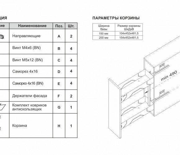 В комплекте: корзина, комплект направляющих, комплект держателей фасада, комплект ковриков противоскользящих, весь необходимый крепёж, инструкция.