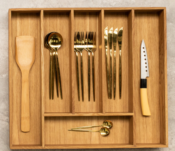 Вкладыш для столовых приборов выполнен из экологически чистого прочного дерева -дуб, материал не впитывает запахи, легко моется, не деформируется. Удобное приспособление для организации кухонного пространства. Подставка для столовых приборов вместительная и компактная, сохранит порядок и не займет много места, идеально подойдет для ящика кухонного гарнитура. Вкладыш для ножей универсальный приобретается отдельно.