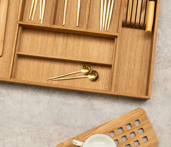 Вкладыш для столовых приборов выполнен из экологически чистого прочного дерева -дуб, материал не впитывает запахи, легко моется, не деформируется. Удобное приспособление для организации кухонного пространства. Подставка для столовых приборов вместительная и компактная, сохранит порядок и не займет много места, идеально подойдет для ящика кухонного гарнитура. Вкладыш для ножей универсальный приобретается отдельно.