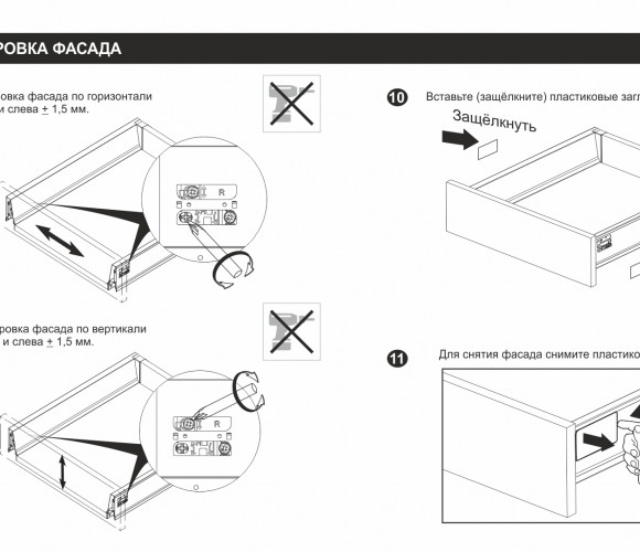 Конструкция СТАРТ PUSH SB09 имеет регулировочный красный винт — он позволяет выровнять фасады по глубине и компенсировать погрешности производства и монтажа. Специальные риски на направляющей помогут выставить одинаковое положение регулировки на обеих направляющих (левой и правой).