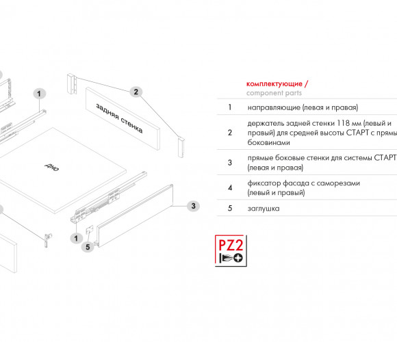 СТАРТ SB19 – комплект систем выдвижения для сборки выдвижного мебельного ящика с прямыми боковинами средней высоты 118 мм для минимальной высоты проёма 147 мм. Комплект включает в себя направляющие, прямые боковины, держатели фасада и задней стенки, заглушки с логотипом BOYARD и необходимый крепёж.
