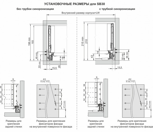 Комплект SB30 включает в себя: направляющие (левая и правая), детали для установки трубки синхронизации с крепежом, держатели задней стенки, традиционные боковые стенки, фиксаторы фасада, заглушки, крепёж.