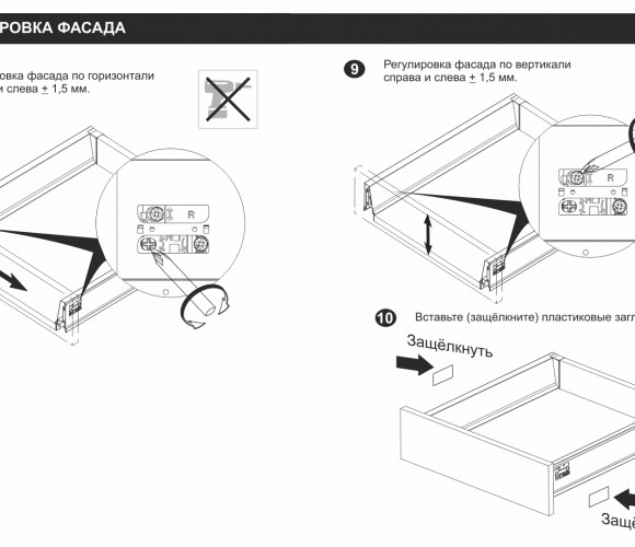 Конструкция СТАРТ PUSH SB30 имеет регулировочный красный винт — он позволяет выровнять фасады по глубине и компенсировать погрешности производства и монтажа. Специальные риски на направляющей помогут выставить одинаковое положение регулировки на обеих направляющих (левой и правой).