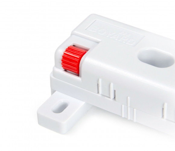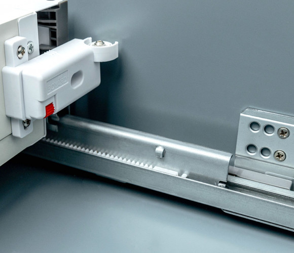 Стабилизатор прост в монтаже: закрепляется с обратной стороны мебельного ящика, что делает его полностью скрытым от глаз.