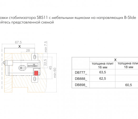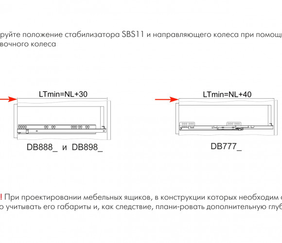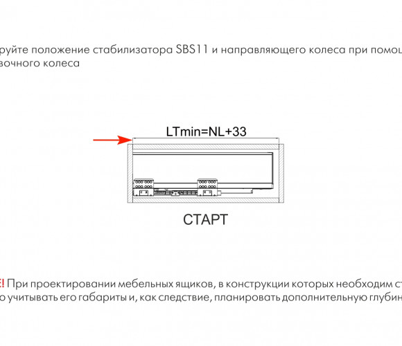 Для грамотного монтажа необходимо учитывать габариты стабилизатора на этапе проектирования мебели — между задней стенкой корпуса изделия и задней стенкой мебельного ящика необходимо оставить пространство под SBS11.