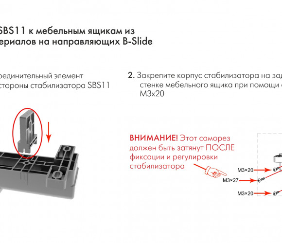 За счёт специального регулировочного колеса красного цвета осуществляется смещение конструкции SBS11 в левом или правом направлении. Прорезиненный обод направляющего колеса обеспечит бесшумную работу стабилизатора. Удобные риски на корпусе изделия позволят установить одинаковое положение стабилизаторов для максимально равномерного и синхронного выдвижения мебельного ящика.