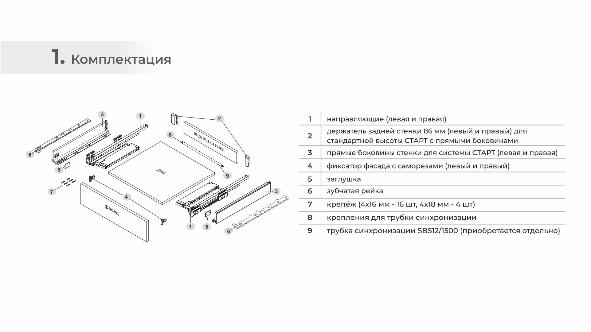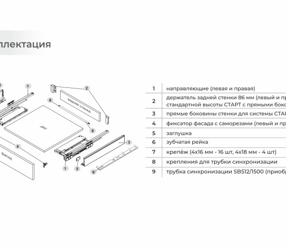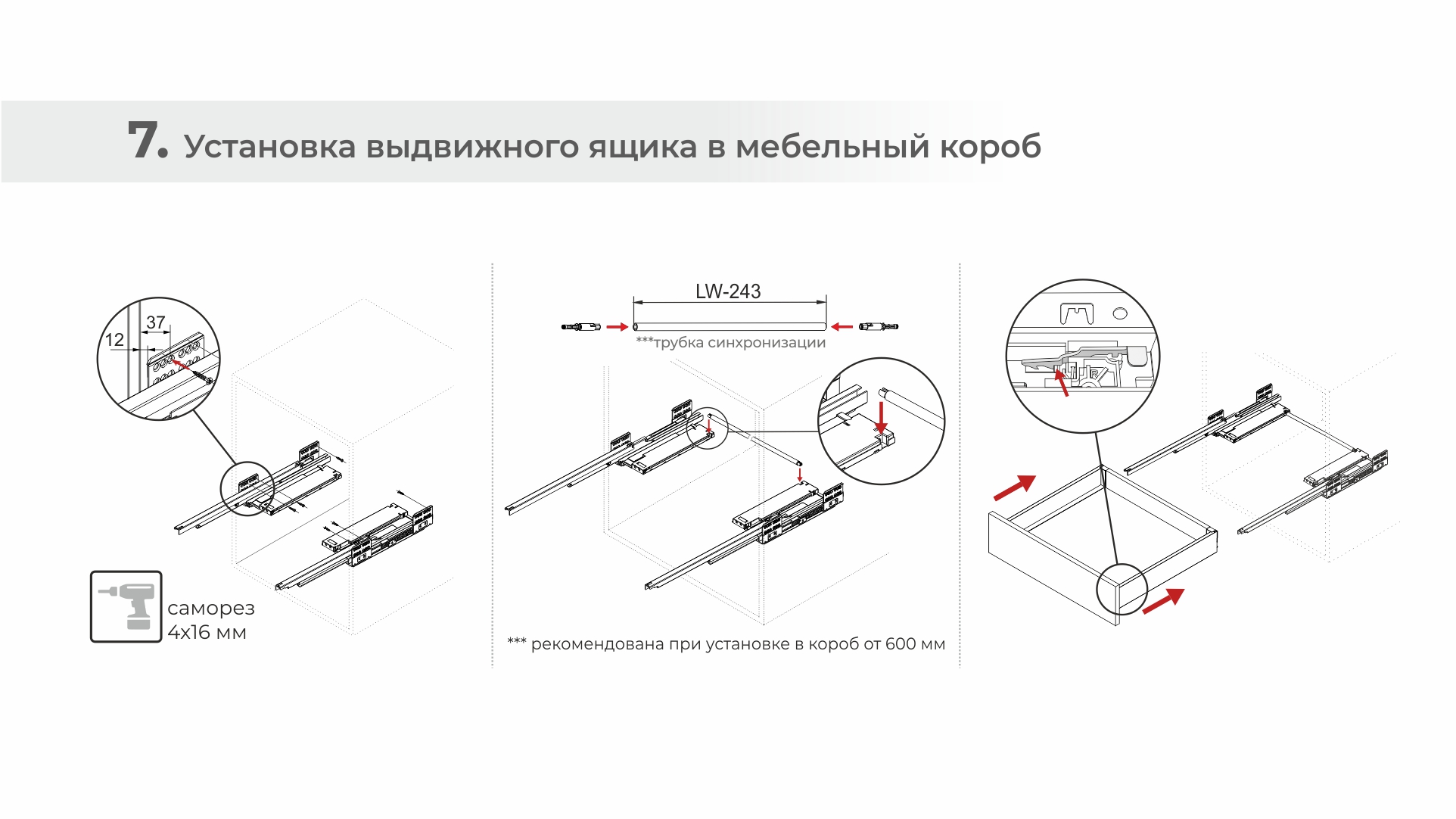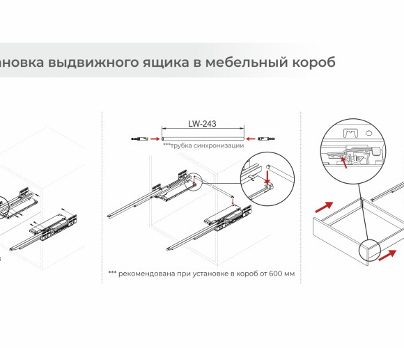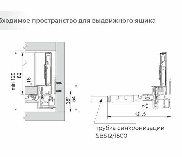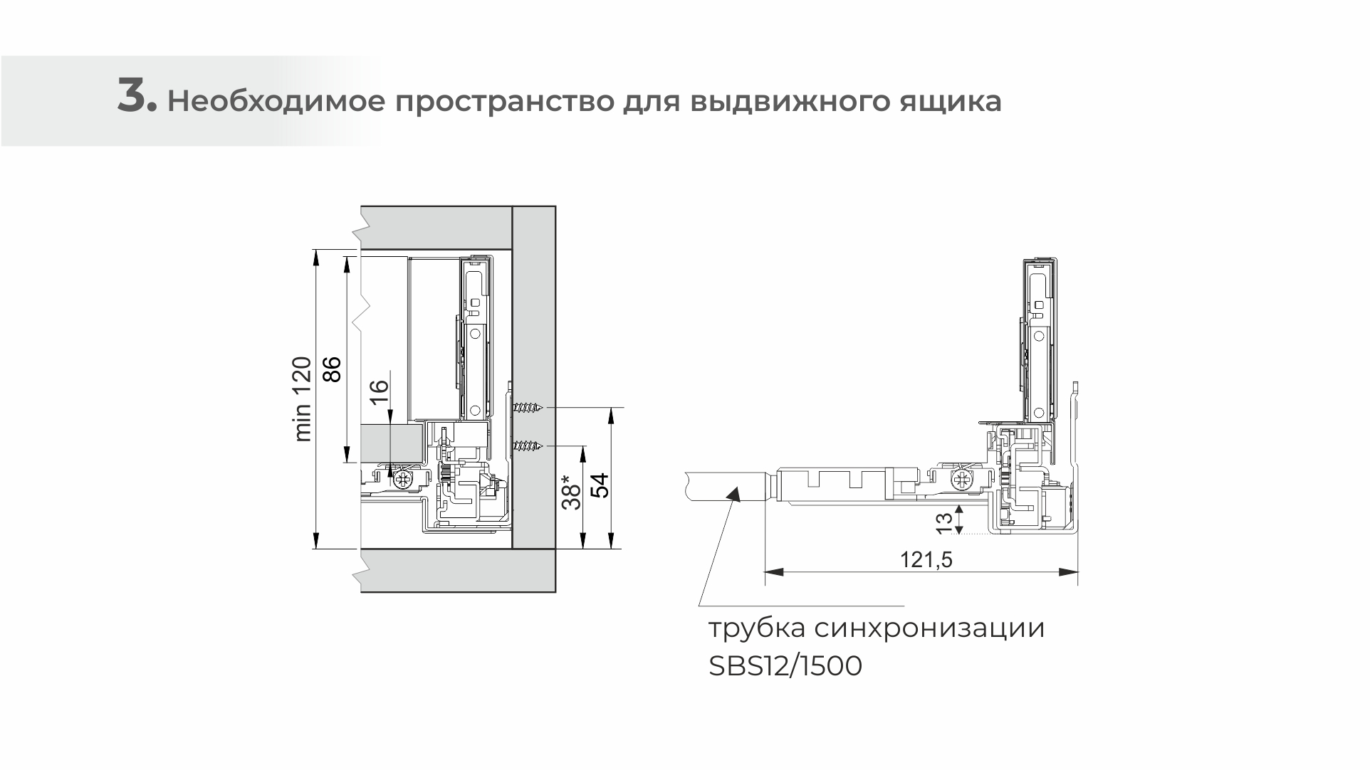 При создании габаритных мебельных ящиков шириной от 600 мм рекомендуется использовать поворотно-синхронизирующую трубку SBS12. Держатели для трубки представлены в комплекте СТАРТ PUSH+SOFT, а SBS12 приобретается отдельно.