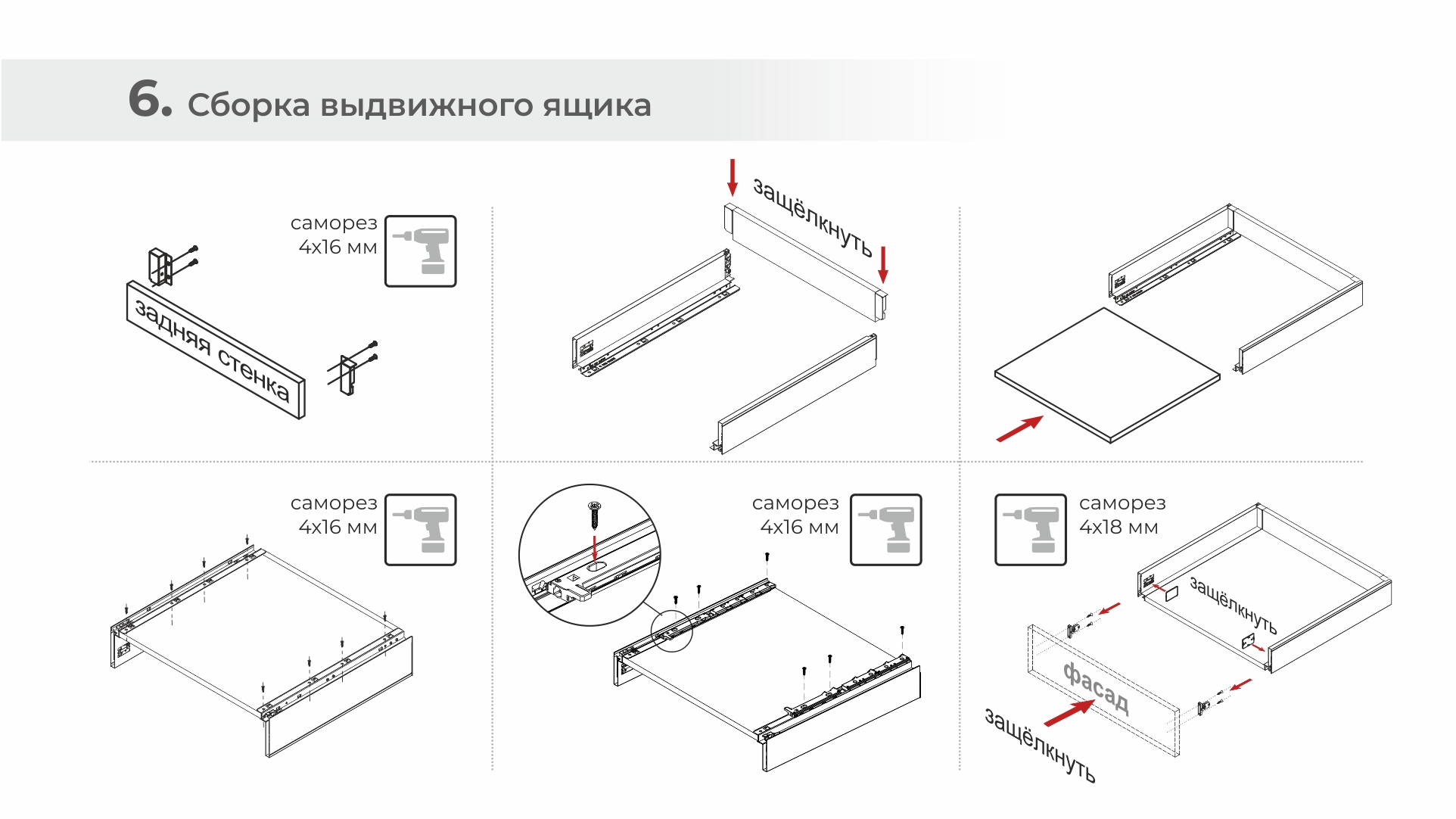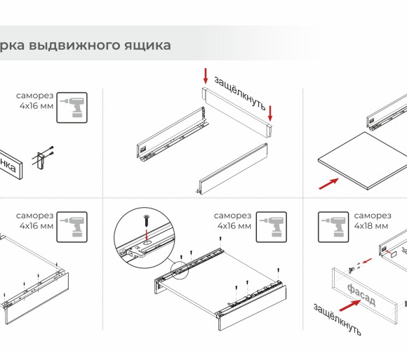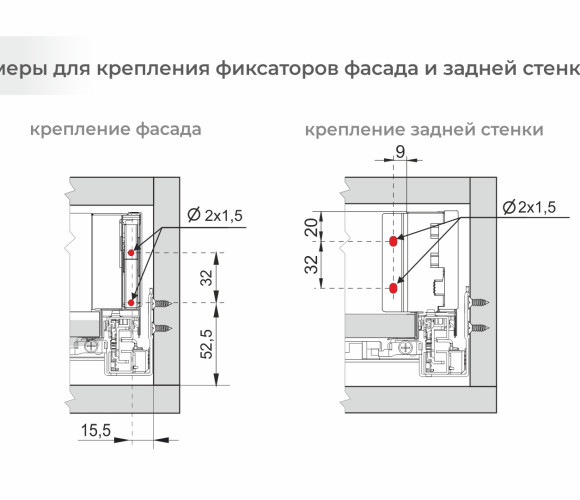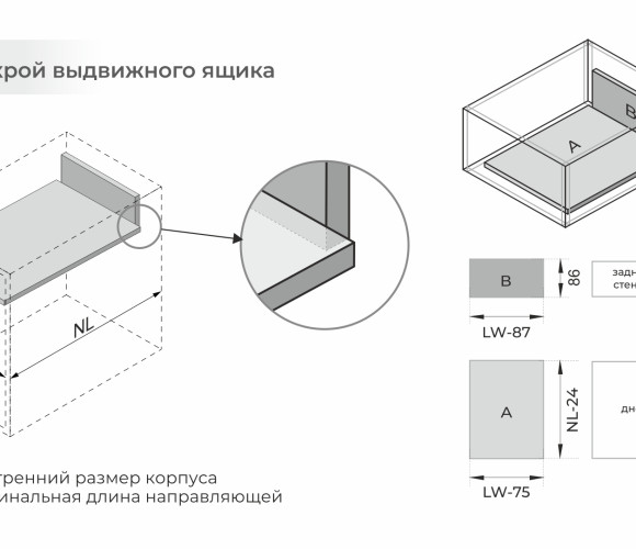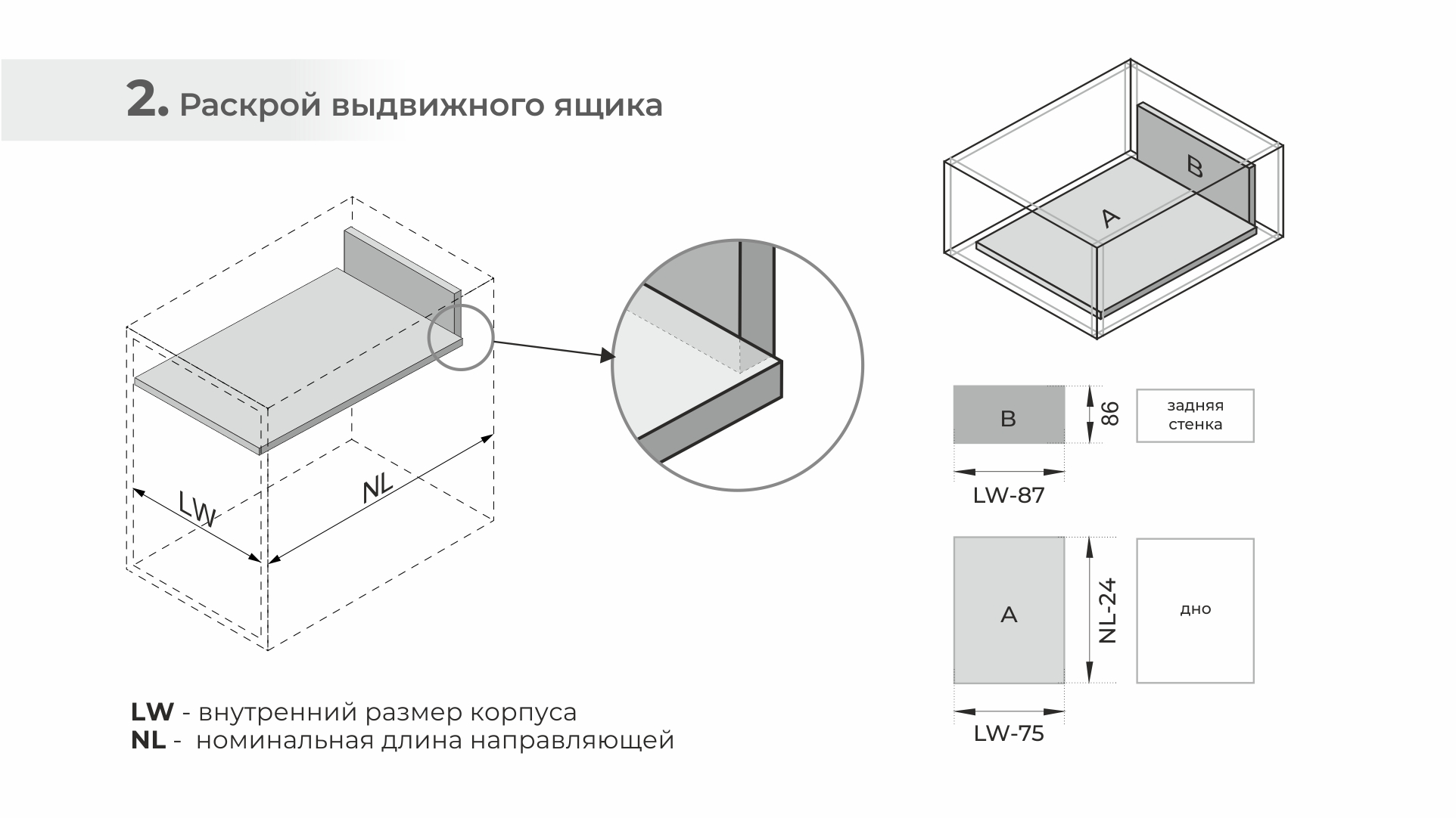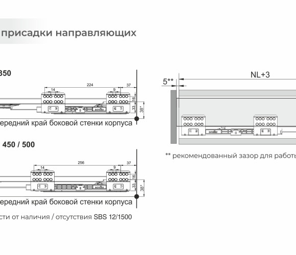Для сборки выдвижного мебельного ящика на базе СТАРТ PUSH+SOFT SB38 необходимо самостоятельно изготовить фасад, заднюю стенку и дно мебельного ящика. Дополнительные рейлинги позволяют увеличить полезную высоту боковых стенок выдвижного ящика. Рейлинги и держатели к ним приобретаются отдельно.
