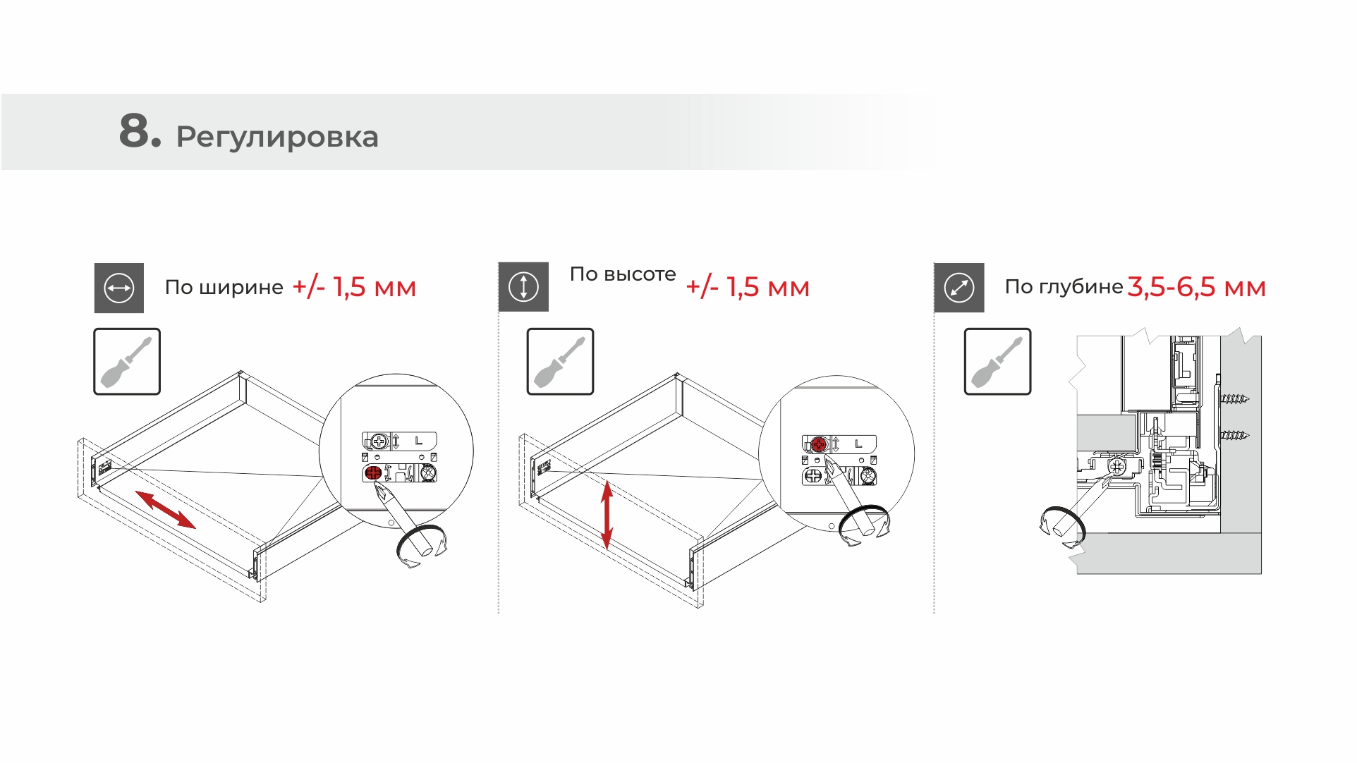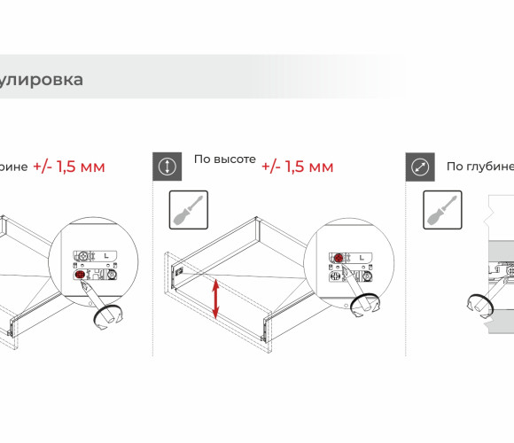 СТАРТ PUSH+SOFT допускает регулировку фасада по ширине и высоте на +/- 1,5 мм.
