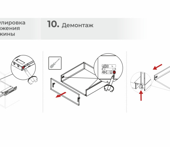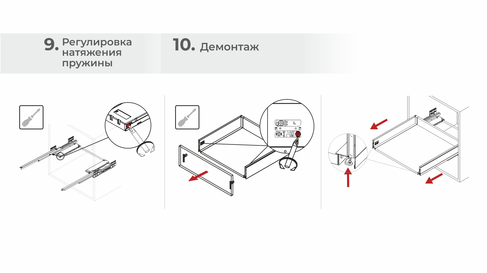 Регулировочный винт в механизме PUSH корректирует параметр усилия на открывание, который зависит от весогабаритных характеристик выдвижного модуля и степени его загрузки.