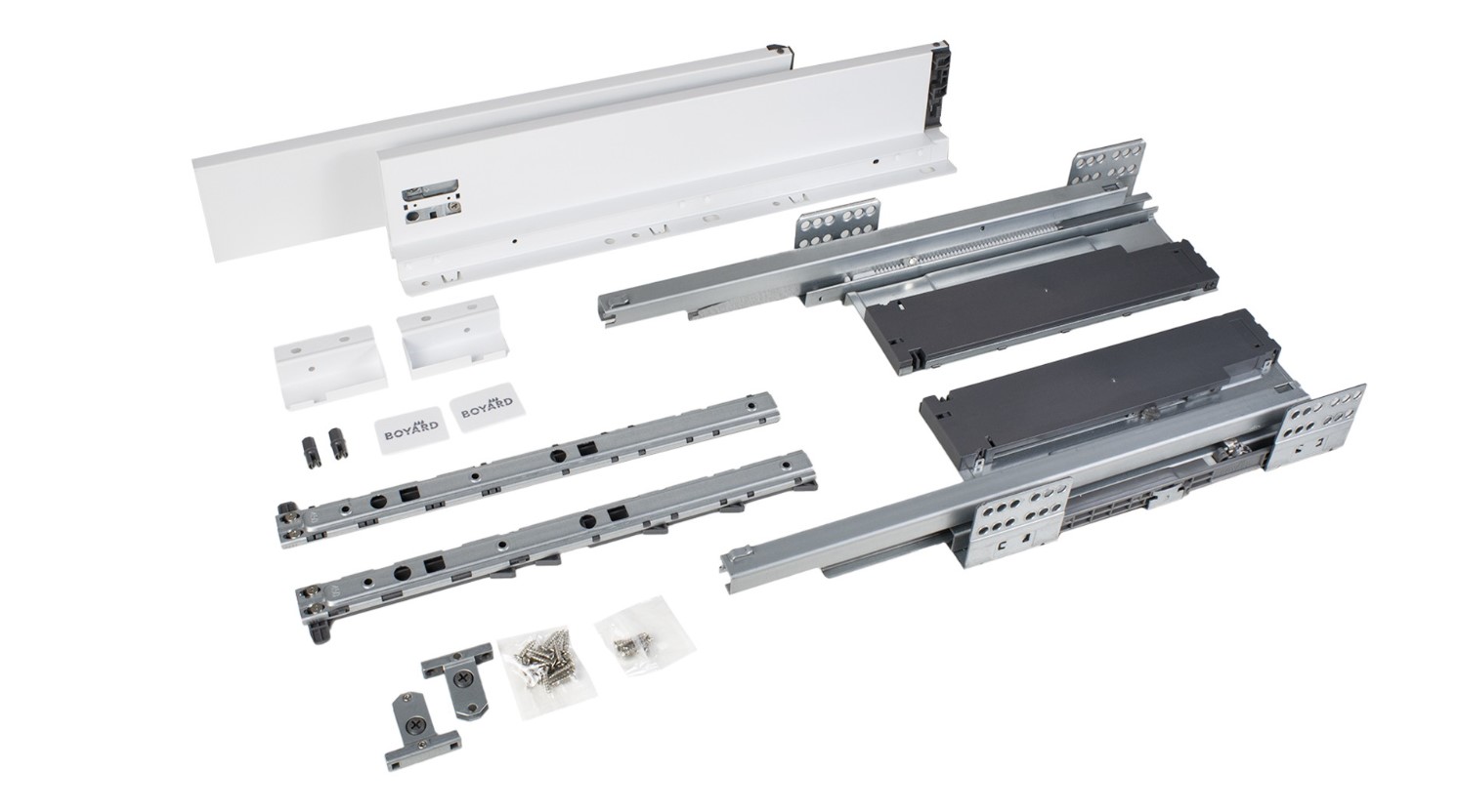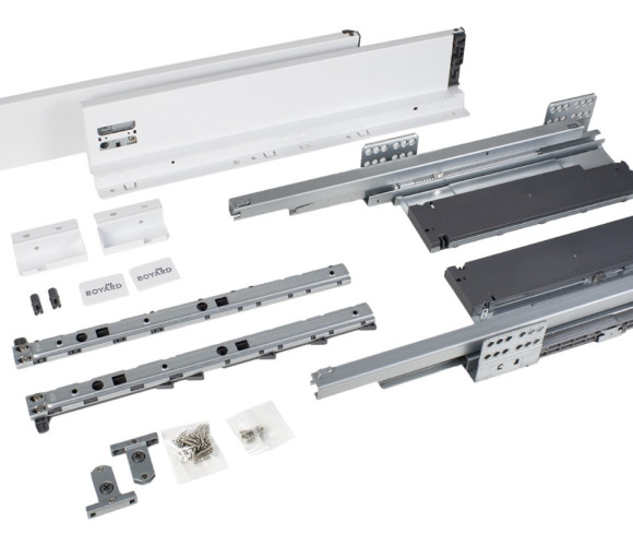 СТАРТ ПУШ+СОФТ SB38 — комплект систем выдвижения для сборки выдвижного ящика с прямыми боковинами стандартной высоты 86 мм для мебели без ручек с открытием от нажатия и плавным доведением.