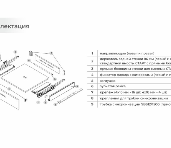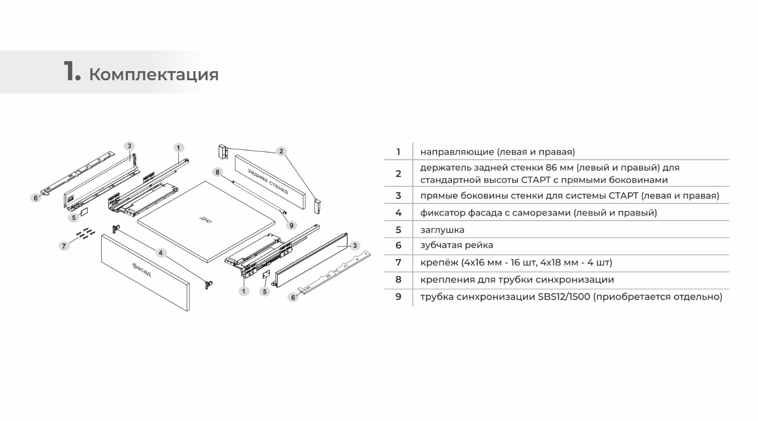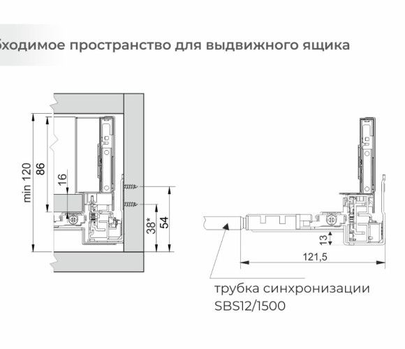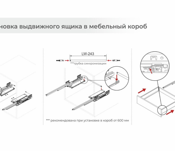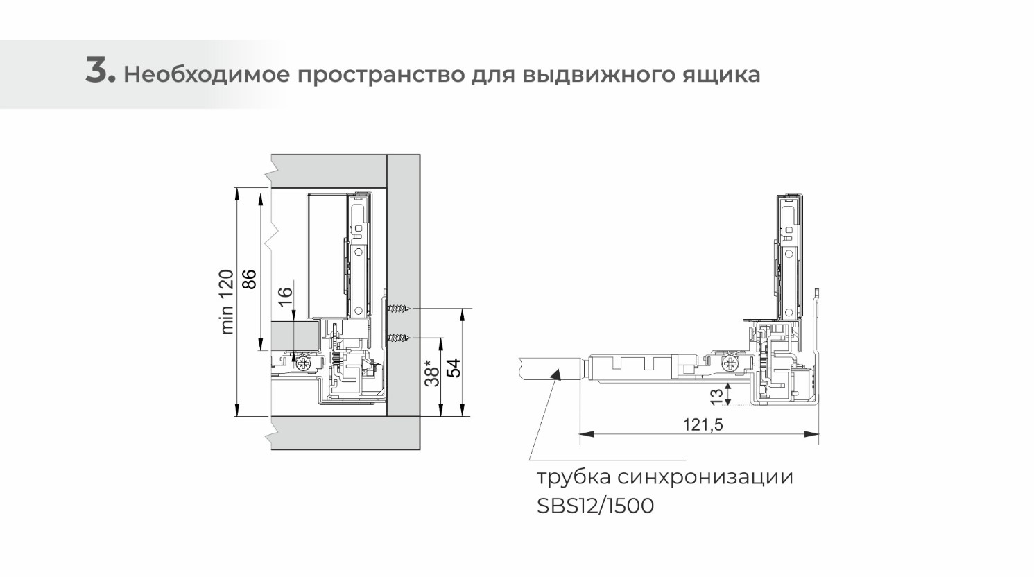 При создании габаритных мебельных ящиков шириной от 600 мм рекомендуется использовать поворотно-синхронизирующую трубку SBS12. Держатели для трубки представлены в комплекте СТАРТ ПУШ+СОФТ, а SBS12 приобретается отдельно.