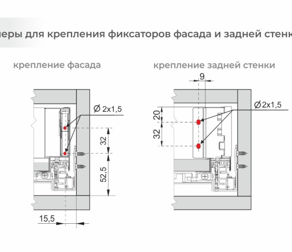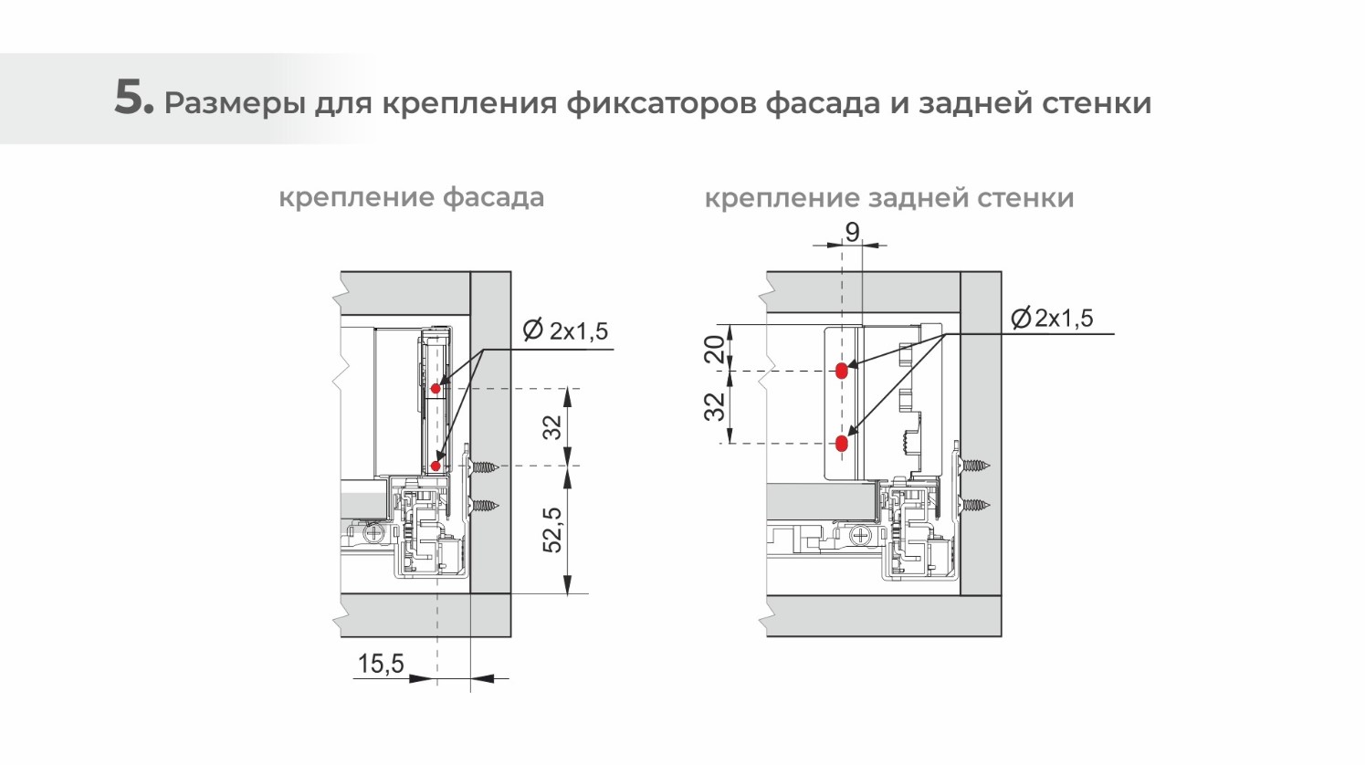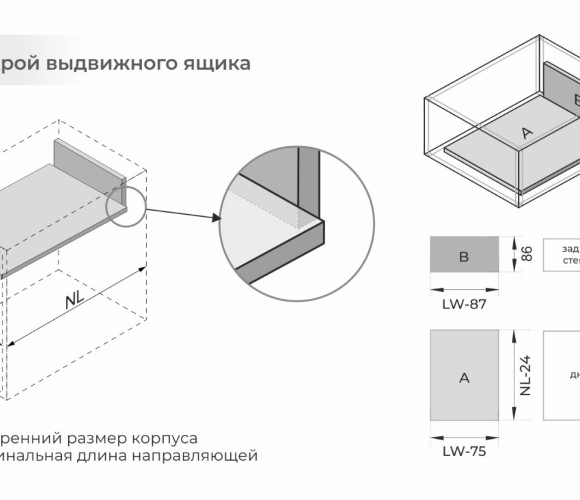 Для сборки выдвижного мебельного ящика на базе СТАРТ ПУШ+СОФТ SB38 необходимо самостоятельно изготовить фасад, заднюю стенку и дно мебельного ящика. Дополнительные рейлинги позволяют увеличить полезную высоту боковых стенок выдвижного ящика. Рейлинги и держатели к ним приобретаются отдельно.