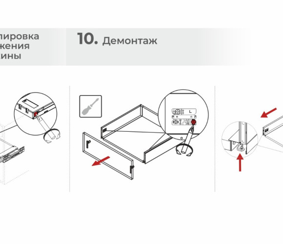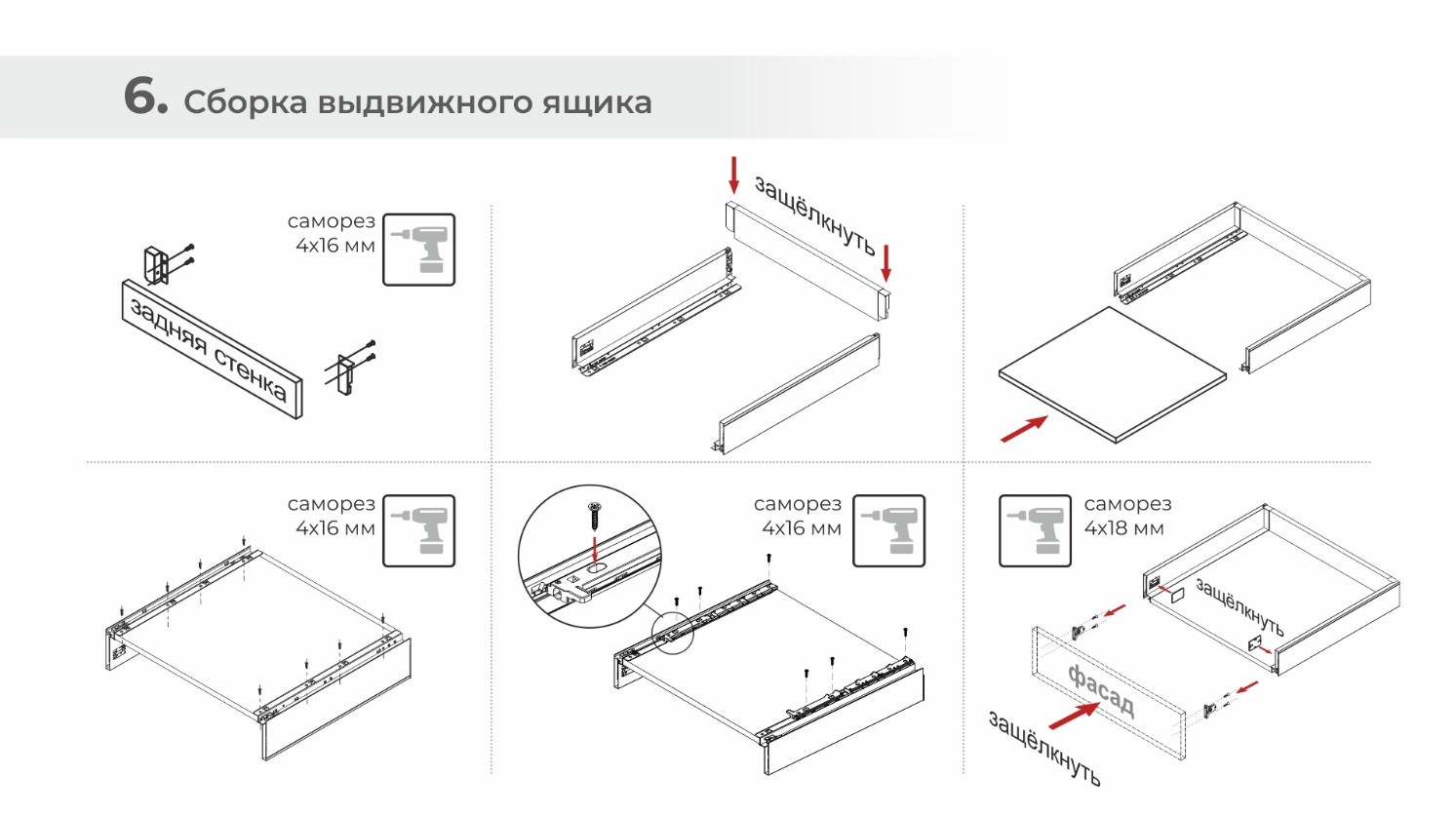 Сборка выдвижного ящика СТАРТ ПУШ+СОФТ проводится по аналогии со сборкой других типов СТАРТ, за исключением одного момента: при креплении боковины ко дну выдвижного ящика необходимо дополнительно прикрепить рейку ответной части механизма ПУШ через пластину крепления боковой стенки. Для простоты процесса на рейке предусмотрены специальные выступы, которые входят в отверстия пластины боковой стенки.