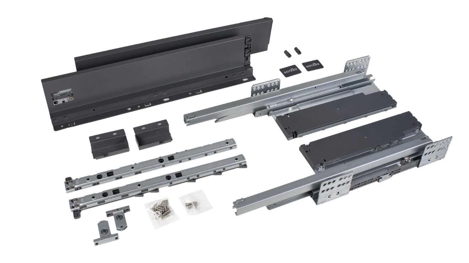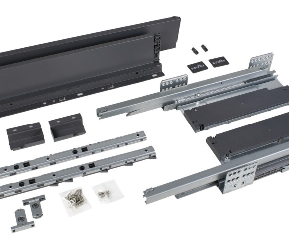 СТАРТ ПУШ+СОФТ SB38 — комплект систем выдвижения для сборки выдвижного ящика с прямыми боковинами стандартной высоты 86 мм для мебели без ручек с открытием от нажатия и плавным доведением.