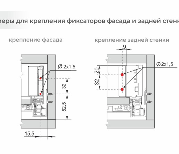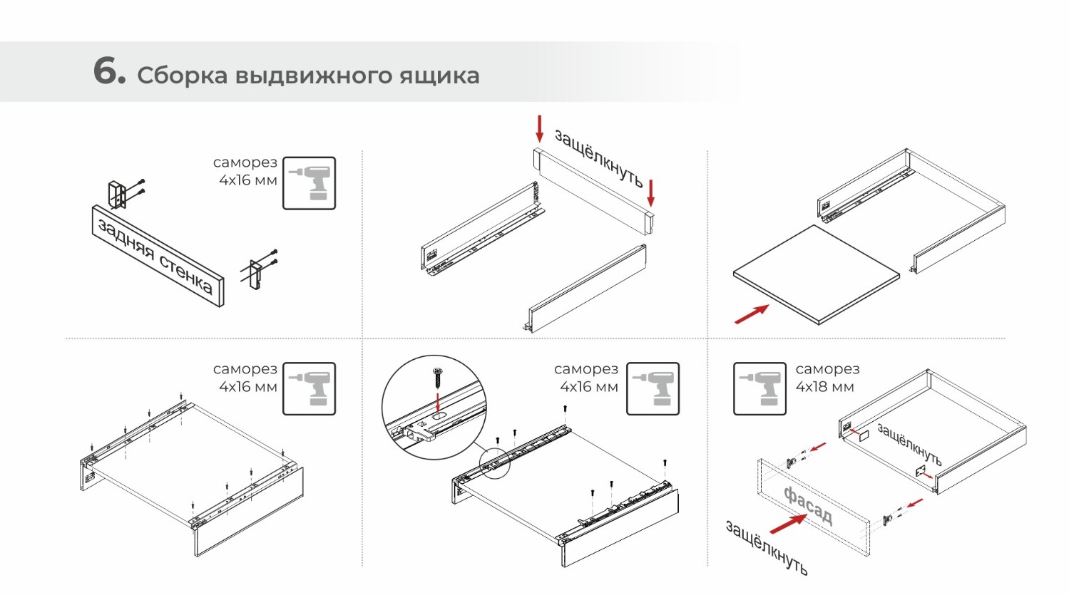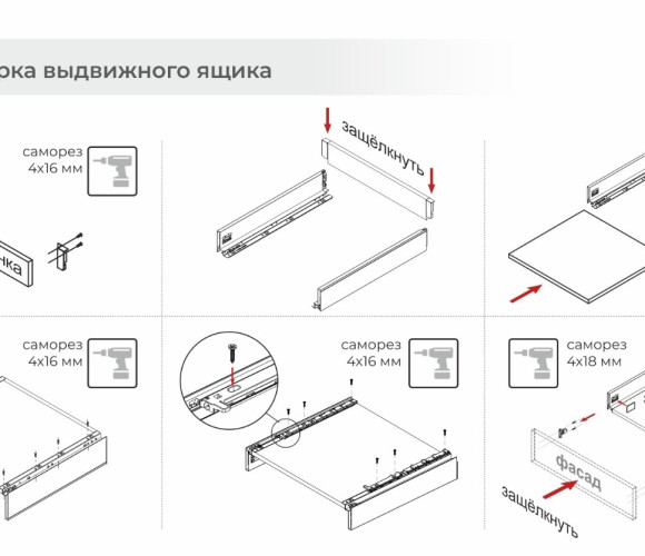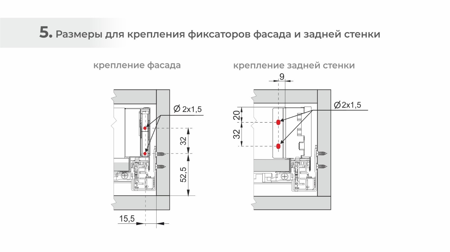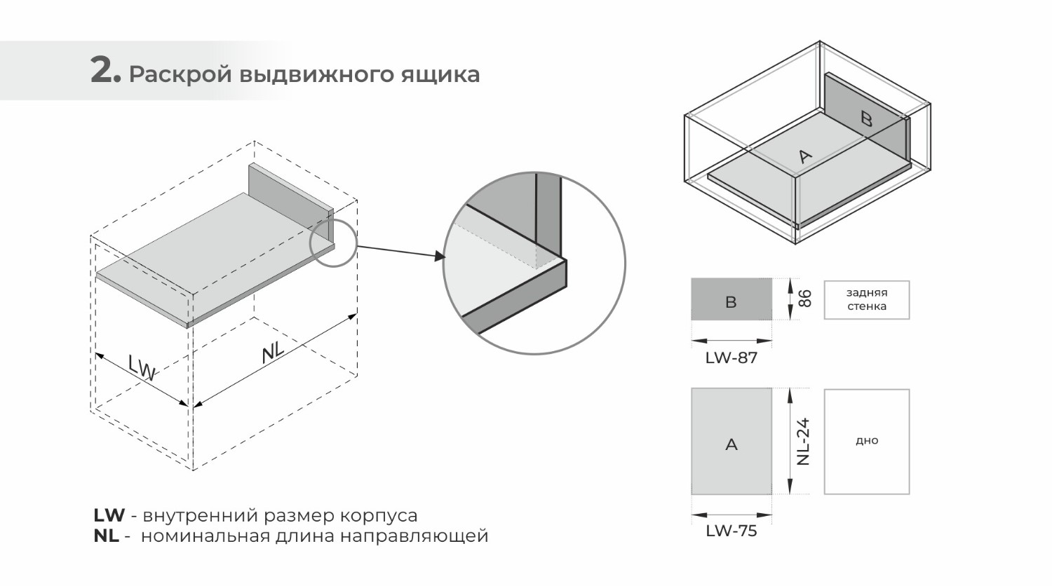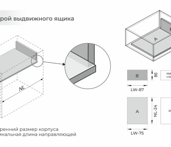 Для сборки выдвижного мебельного ящика на базе СТАРТ ПУШ+СОФТ SB38 необходимо самостоятельно изготовить фасад, заднюю стенку и дно мебельного ящика. Дополнительные рейлинги позволяют увеличить полезную высоту боковых стенок выдвижного ящика. Рейлинги и держатели к ним приобретаются отдельно.