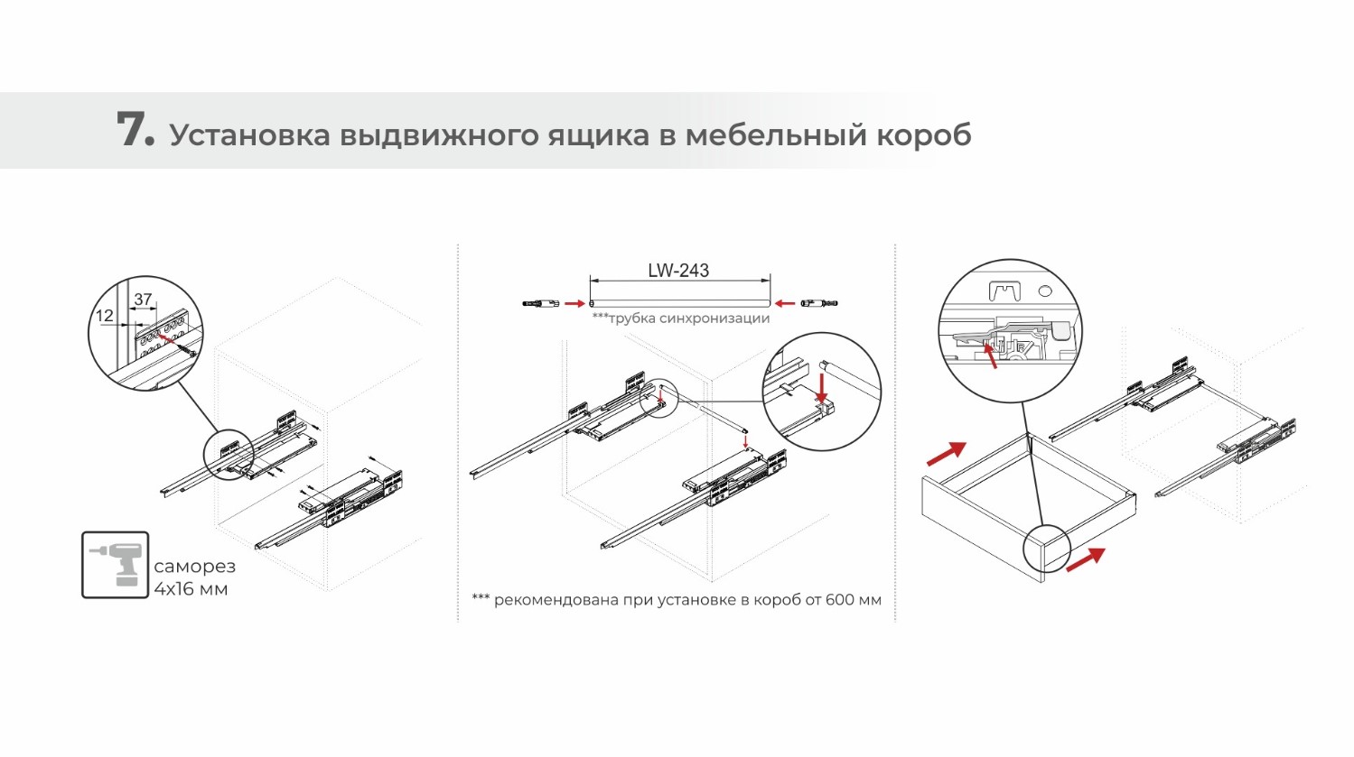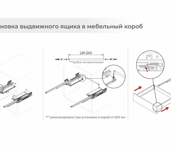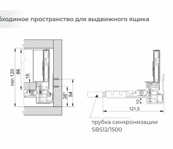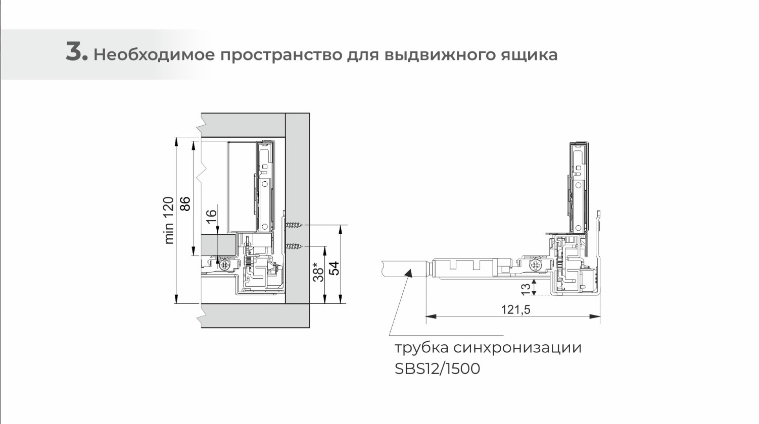 При создании габаритных мебельных ящиков шириной от 600 мм рекомендуется использовать поворотно-синхронизирующую трубку SBS12. Держатели для трубки представлены в комплекте СТАРТ ПУШ+СОФТ, а SBS12 приобретается отдельно.