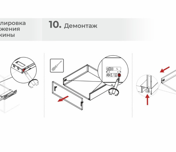 Сборка выдвижного ящика СТАРТ ПУШ+СОФТ проводится по аналогии со сборкой других типов СТАРТ, за исключением одного момента: при креплении боковины ко дну выдвижного ящика необходимо дополнительно прикрепить рейку ответной части механизма ПУШ через пластину крепления боковой стенки. Для простоты процесса на рейке предусмотрены специальные выступы, которые входят в отверстия пластины боковой стенки.