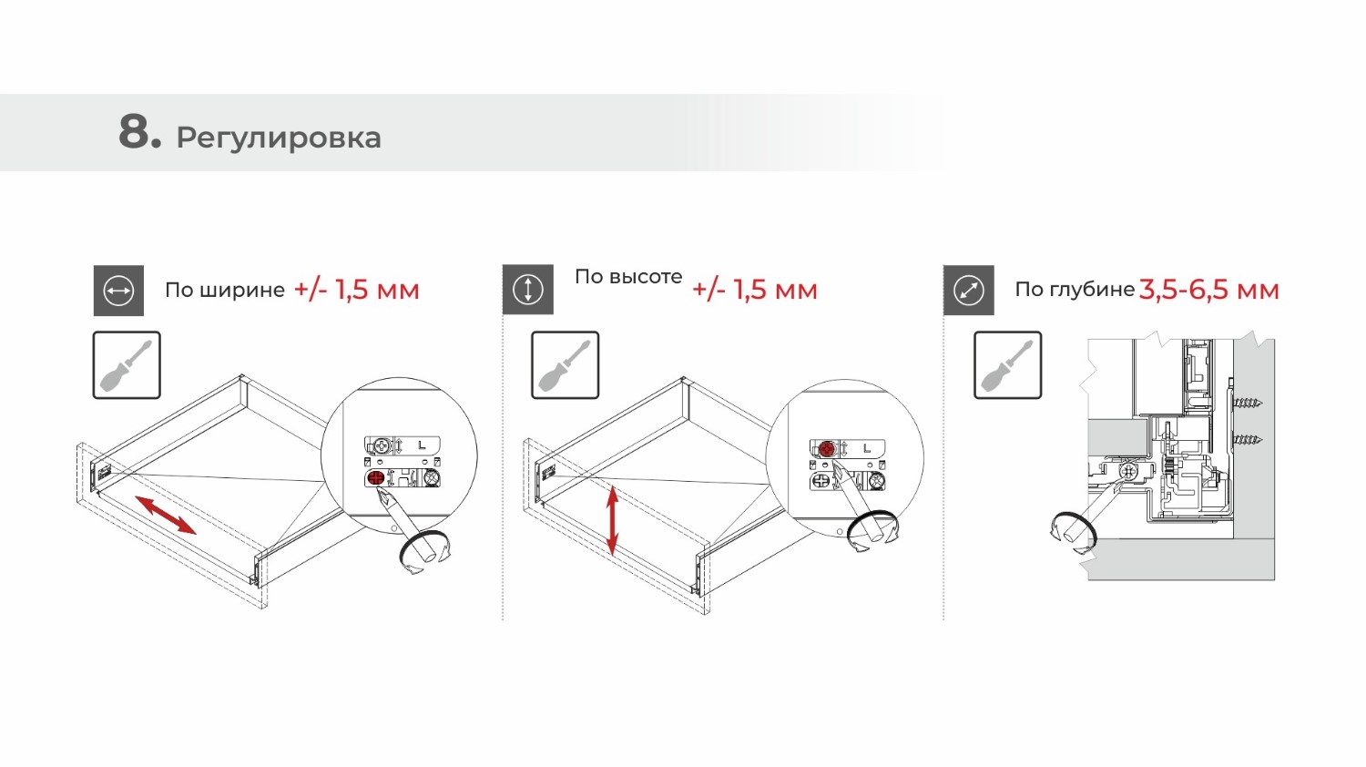 СТАРТ ПУШ+СОФТ допускает регулировку фасада по ширине и высоте на +/- 1,5 мм.