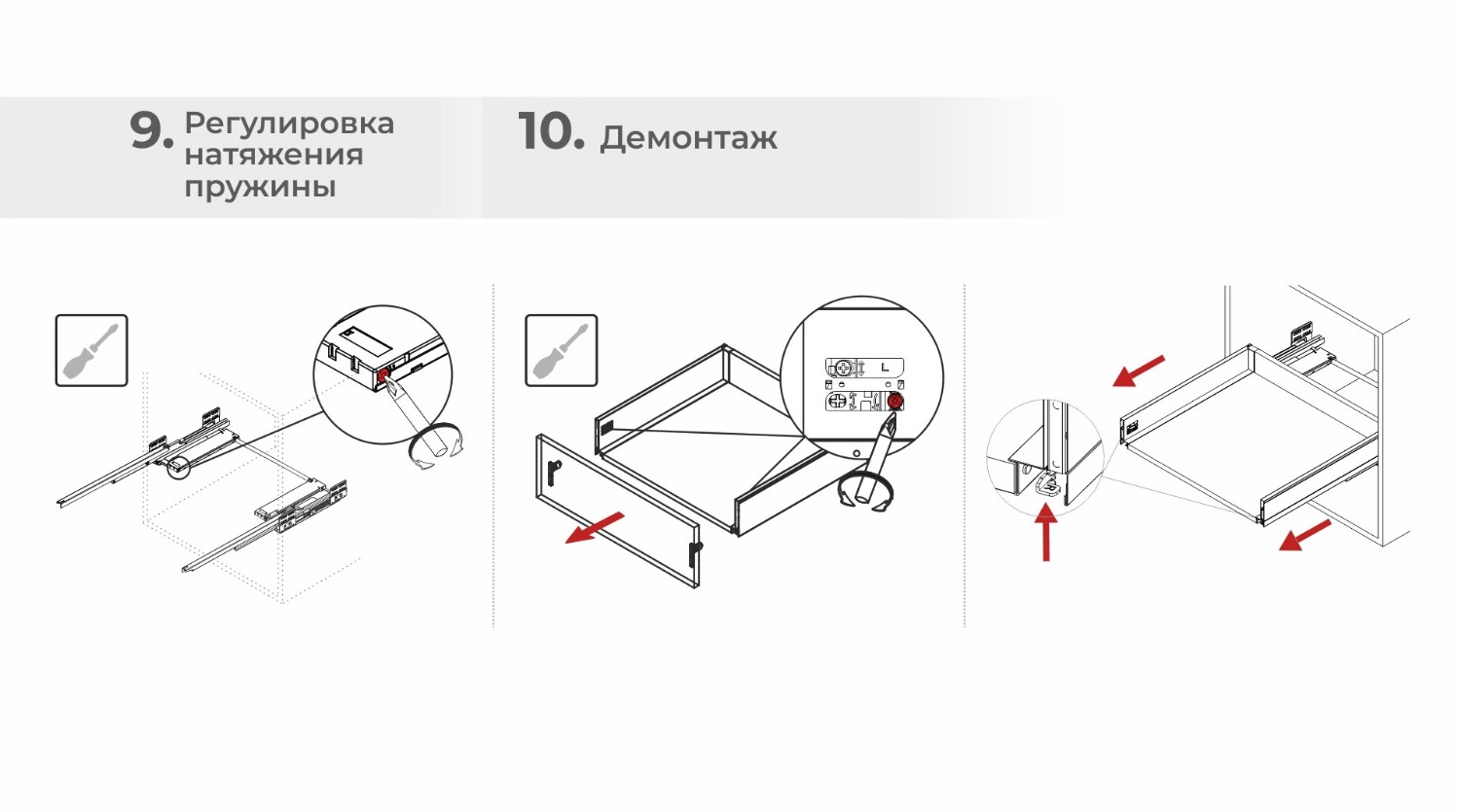 Регулировочный винт в механизме ПУШ корректирует параметр усилия на открывание, который зависит от весогабаритных характеристик выдвижного модуля и степени его загрузки.