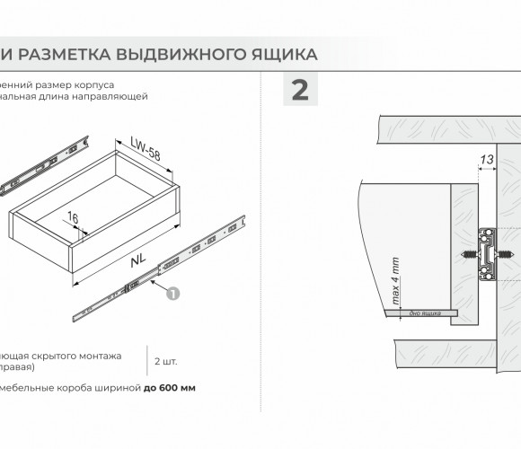 Ширина направляющих составляет ровно 13 мм, а значит раскрой дна для мебельного ящика максимально удобен и прост.
