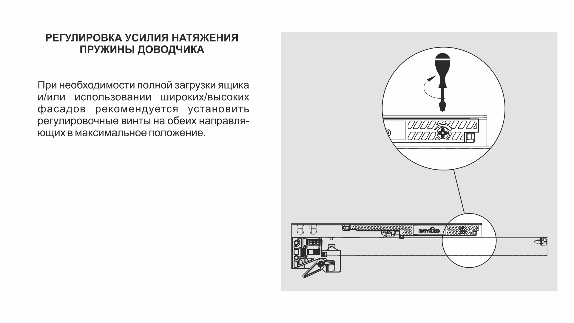 - Adapt-auto — адаптивная регулировка усилия работы доводчика — уникальное технологическое решение BOYARD, которое позволяет легко и быстро «в домашних условиях» ослабить или усилить натяжение пружины доводчика. Опция Adapt-auto незаменима в случае нестандартной нагрузки, когда неглубокий ящик имеет высокий и тяжелый фасад, или же когда груз внутри ящика распределен ближе к фасаду. В случае многолетней активной эксплуатации мебели пружину доводчика можно подтянуть и доводчик будет работать как в день установки направляющих. Усиливать или облегчать натяжение пружины пользователи мебели могут самостоятельно, выставив подходящее положение регулировочного винта в доводчике при помощи обычной крестовой отвертки.