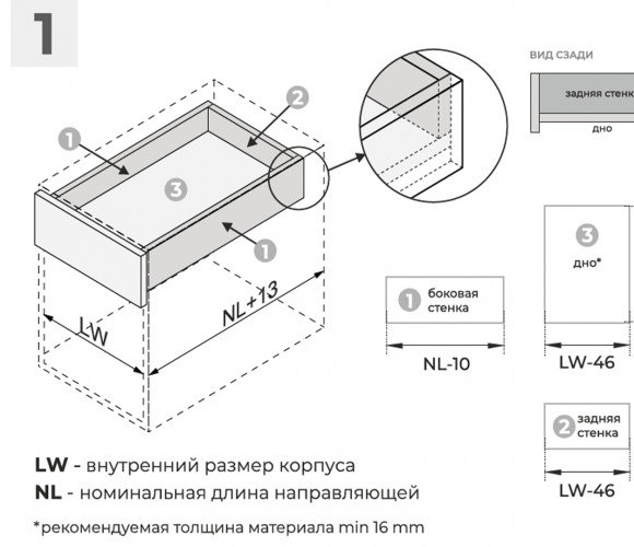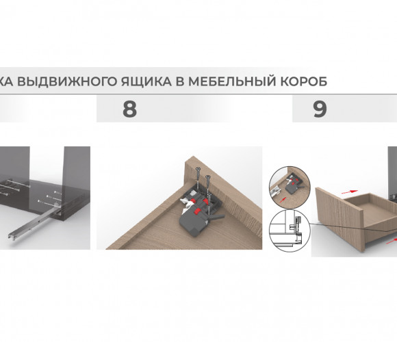 Разница в монтаже коротких и больших длин заключается в значении min отступа от дна мебельного корпуса до верхнего ряда присадочных отверстий направляющей. У неглубоких моделей, до 350 мм включительно, это значение составляет min 39 мм. Установка по схеме позволяет достичь зазора в 2 мм между мебельным корпусом и направляющей. Именно корректный монтаж в соответствие со схемой позволяет избежать отклонения фасада с высотой 250-300 мм в верхней части от плоскости торца боковой стенки мебельного изделия.
