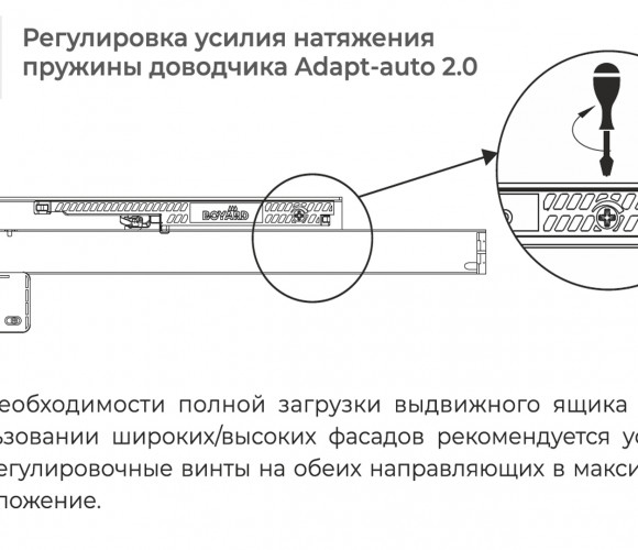 Adapt-auto — адаптивная регулировка усилия работы доводчика — уникальное технологическое решение BOYARD, которое позволяет легко и быстро «в домашних условиях» ослабить или усилить натяжение пружины доводчика. Опция Adapt-auto незаменима в случае нестандартной нагрузки, когда неглубокий ящик имеет высокий и тяжелый фасад, или же когда груз внутри ящика распределен ближе к фасаду. В случае многолетней активной эксплуатации мебели пружину доводчика можно подтянуть, и доводчик будет работать как в день установки направляющих. Усиливать или облегчать натяжение пружины пользователи мебели могут самостоятельно, выставив подходящее положение регулировочного винта в доводчике при помощи обычной крестовой отвертки.