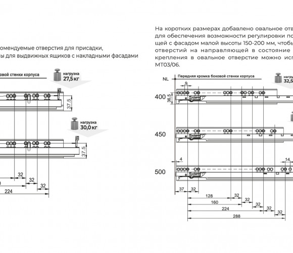 Разница в монтаже коротких и больших длин заключается в значении min отступа от дна мебельного корпуса до верхнего ряда присадочных отверстий направляющей. У неглубоких моделей, до 350 мм включительно, это значение составляет min 39 мм. Установка по схеме позволяет достичь зазора в 2 мм между мебельным корпусом и направляющей. Именно корректный монтаж в соответствие со схемой позволяет избежать отклонения фасада с высотой 250-300 мм в верхней части от плоскости торца боковой стенки мебельного изделия.
