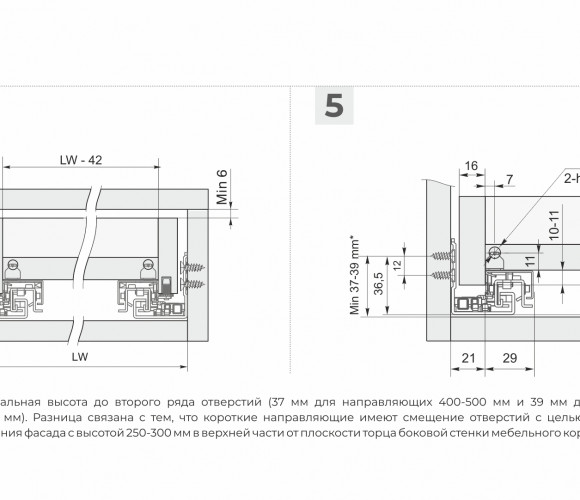 В коротких длинах направляющих DB8785 (250-350 мм) предусмотрено смещение оси присадочных отверстий. Это обеспечивает точное и плотное прилегание фасадов к боковинам мебельного корпуса, даже если неглубокий выдвижной ящик устанавливается с габаритными, высокими фасадами.